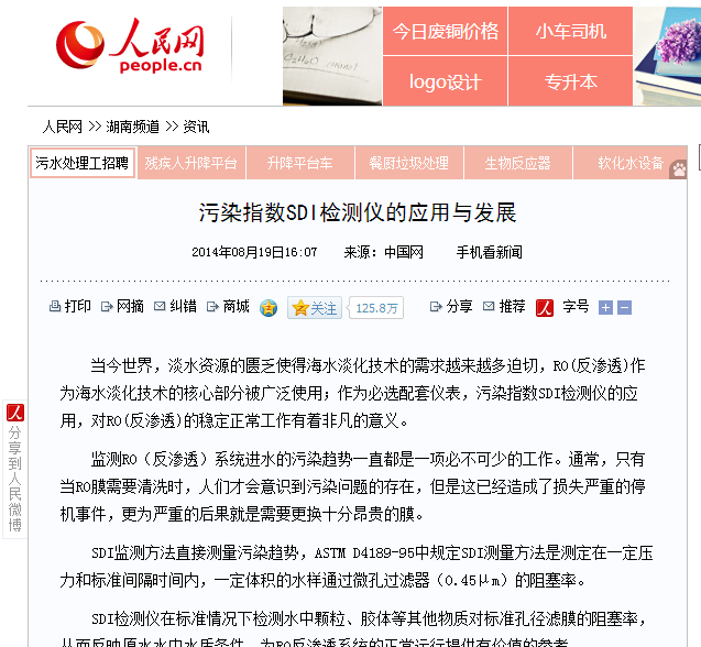 人民网专题“污染指数SDI检测仪的应用与发展”
